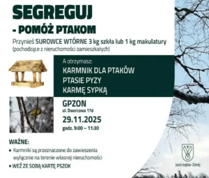 W trosce o ptaki, wzorem lat poprzednich, przygotowano akcję, podczas której mieszkańcy naszego miasta mogą otrzymać 450 karmników oraz karmę. W najbliższą sobotę, tj. 29 listopada, między godziną 9:00 a 11:30, w Gminnym Punkcie Zbierania Odpadów Niebezpiecznych będzie można otrzymać karmnik oraz karmę w zamian za oddane surowce wtórne.