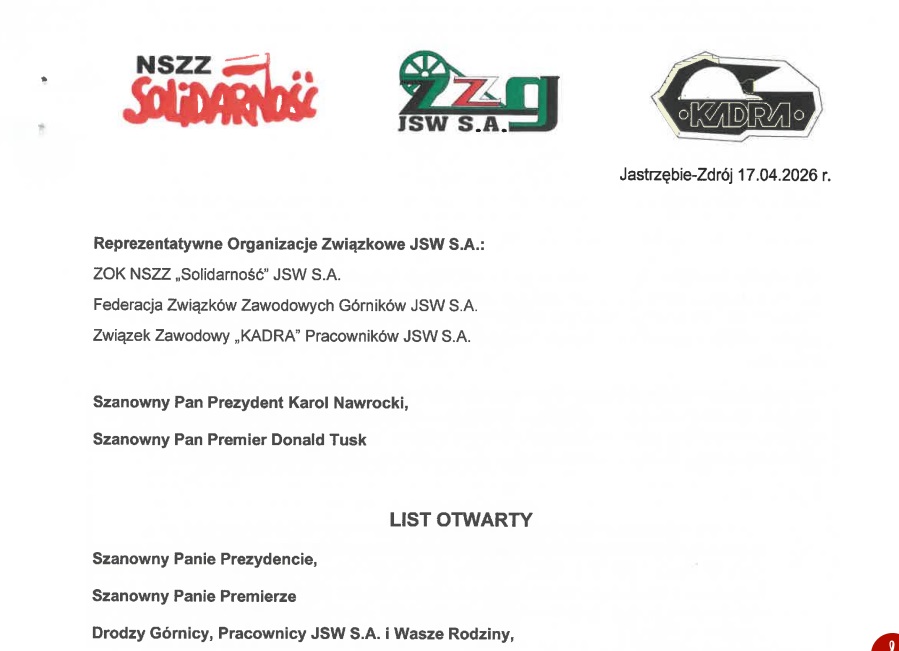 Reprezentatywne Organizacje Związkowe JSW S.A.: ZOK NSZZ “Solidarność”, Federacja Związków Zawodowych Górników oraz Związek Zawodowy “KADRA” skierowały […]