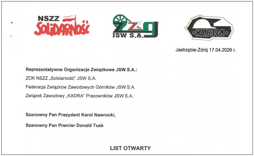 Reprezentatywne Organizacje Związkowe JSW S.A.: ZOK NSZZ “Solidarność”, Federacja Związków Zawodowych Górników oraz Związek Zawodowy “KADRA” skierowały list otwarty do Prezydenta i Premiera RP. W liście napisali między innymi: